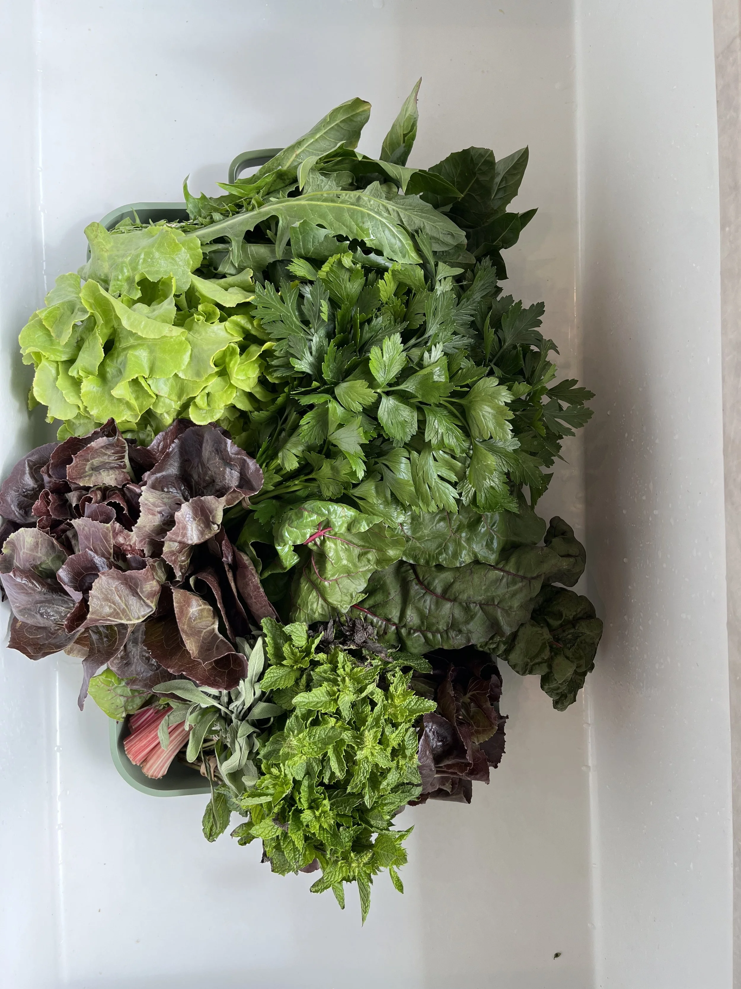 Assorted fresh leafy greens and herbs including lettuce and Swiss chard in a container.