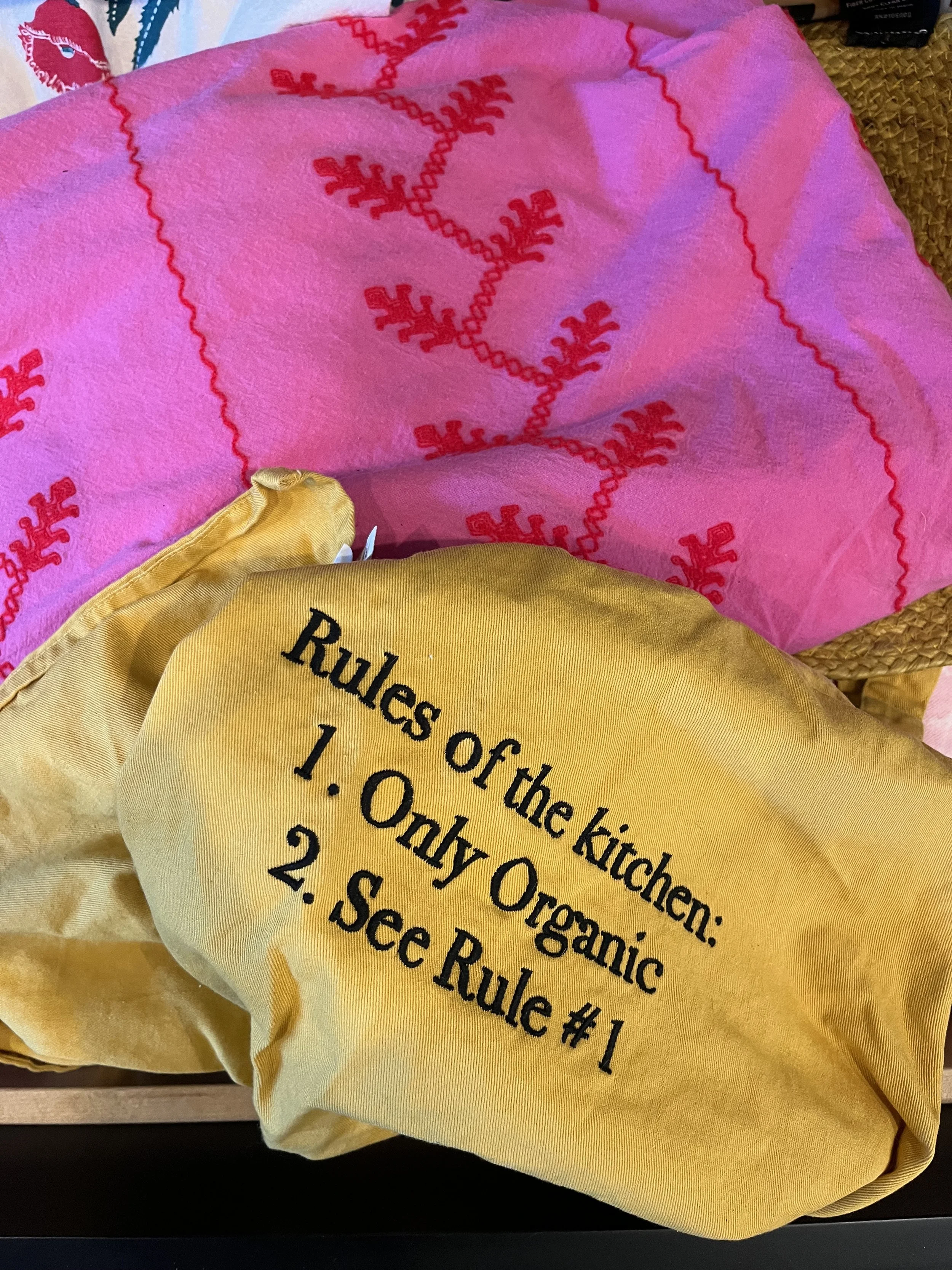 Two cloth items, one pink with red embroidery and another tan with black text reading, "Rules of the kitchen: 1. Only Organic 2. See Rule #1."