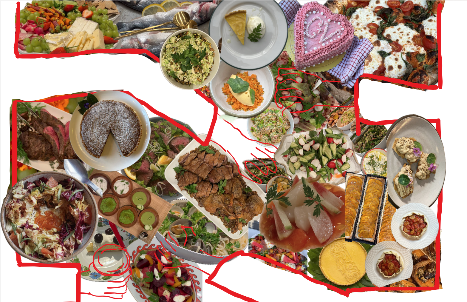 A collage of various dishes, including salads, grilled meats, a heart-shaped cake, pizzas, desserts, and appetizers. There's a mix of colorful vegetables, fruits, and garnished plates, showcasing a wide range of cuisines and culinary styles.